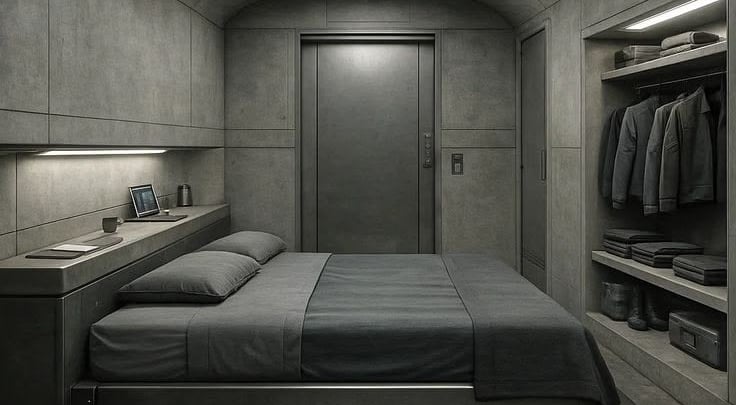 A sleek underground safe room with reinforced steel doors and matte charcoal walls illuminated by soft gold lighting.